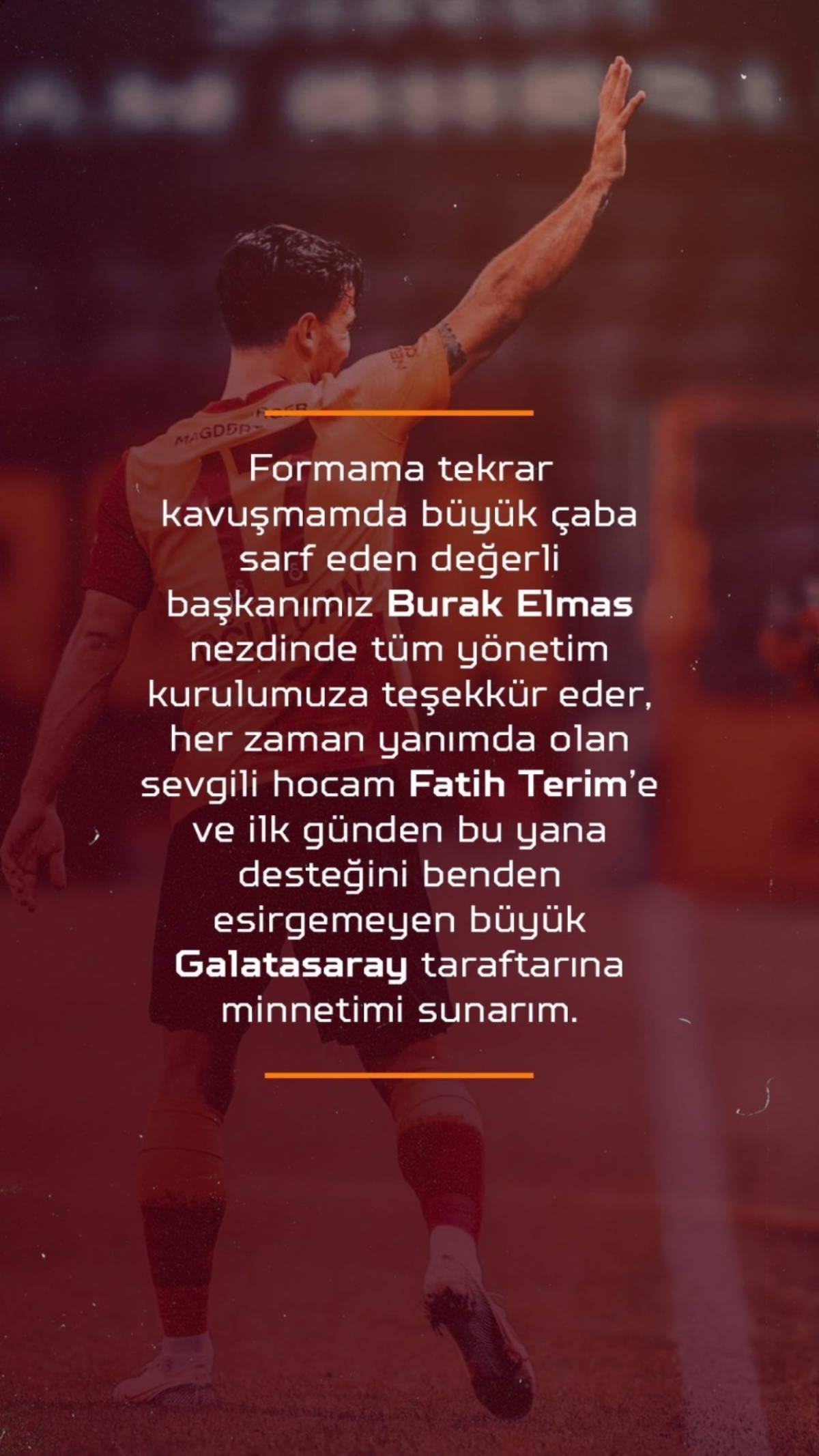 "Formama tekrar kavuşmamda büyük çaba sarf eden değerli başkanımız Burak Elmas nezdinde tüm yönetim kurulumuza teşekkür eder, her zaman yanımda olan sevgili hocam Fatih Terim'e ve ilk günden bu yana desteğini benden esirgemeyen büyük Galatasaray taraftarına minnetimi sunarım. "