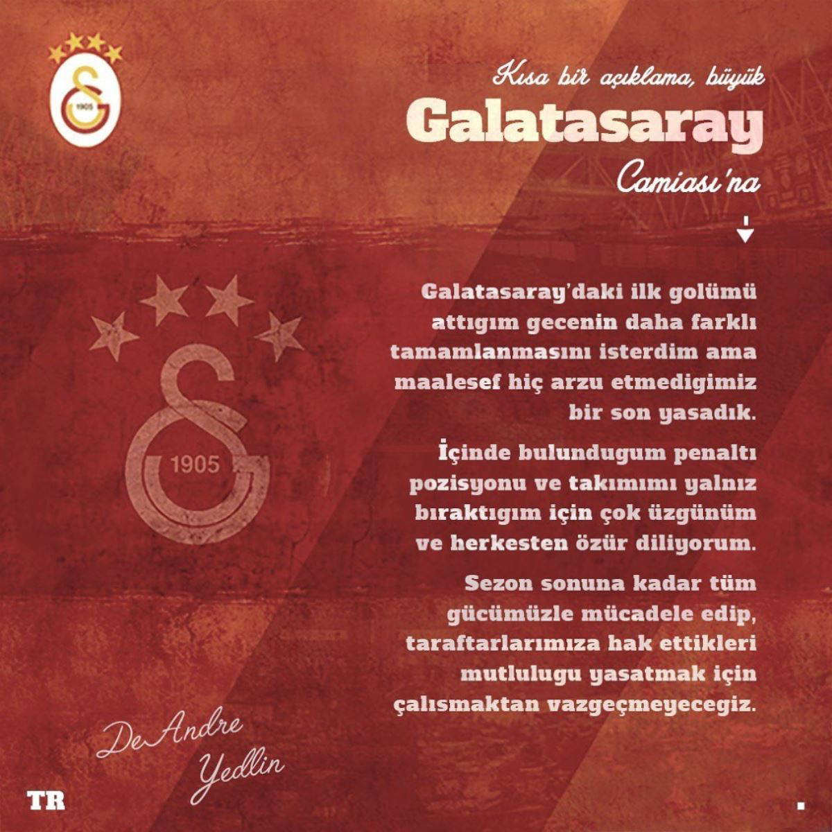 Galatasaray’ın ABD’li futbolcusu DeAndre Yedlin, Çaykur Rizespor’a 4-3 yenildikleri karşılaşmada sarı-kırmızılı forma ile ilk golünü atarken, mücadelede kırmızı kartla oyun dışı da kalmıştı. 27 yaşındaki futbolcu, sosyal medya hesabından yaptığı açıklamada özür diledi. ABD’li futbolcu ’Büyük Galatasaray camiasına’ başlıklı açıklamasında, "Galatasaray’daki ilk golümü attığım gecenin daha farklı tamamlanmasını isterdim ama maalesef hiç arzu etmediğimiz bir son yaşadık. İçinde bulunduğum penaltı pozisyonu ve takımımı yalnız bıraktığım için çok üzgünüm ve herkesten özür diliyorum. Sezon sonuna kadar tüm gücümüzle mücadele edip, taraftarlarımıza hak ettikleri mutluluğu yaşatmak için çalışmaktan vazgeçmeyeceğiz" ifadelerini kullandı.