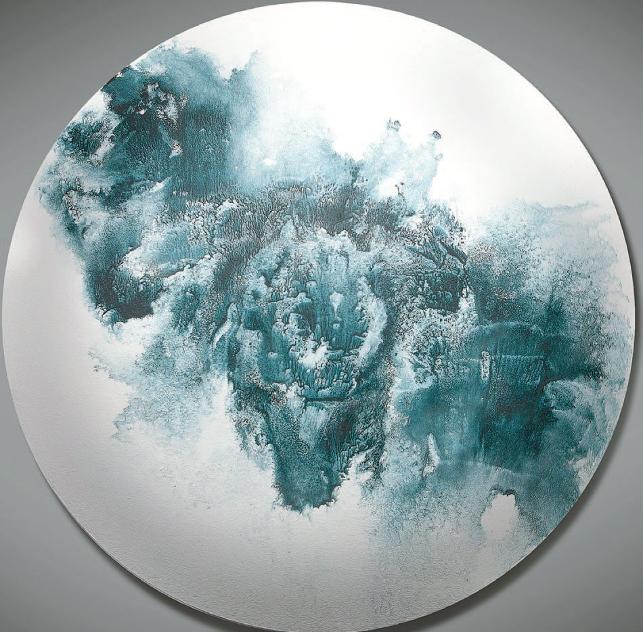 Bir çoğu, dış bükey metalin üzerine suluboya ve akrilik tekniğiyle üretilmiş eserlerin monokrom tonları arasında yer yer bakır, gümüş ve farklı metalik tonlarla katmanlandığını görülüyor.
