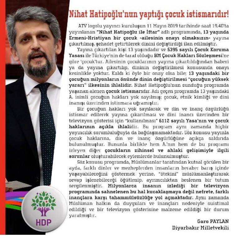 Garo Paylan konuya ilişkin soyal medyada yaptığı paylaşımda, ''Çocuk istismarı yapılan Nihat Hatipoğlu’nun programı hakkında, RTÜK’e, ekteki dilekçe ile şikayette bulundum'' ifadelerini kullandı.