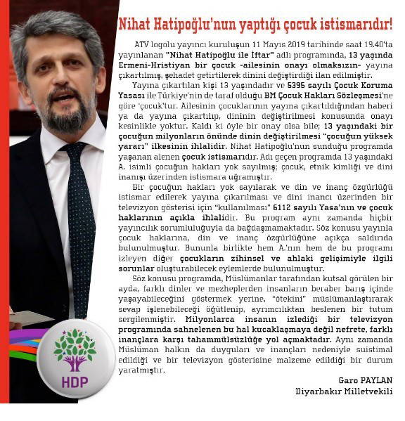 HDP Milletvekili Garo Paylan, Nihat Hatipoğlu'nun televizyon programında bir çocuğun dinini değiştirmesi hakkında RTÜK'e şikayette bulunuğunu açıkladı.