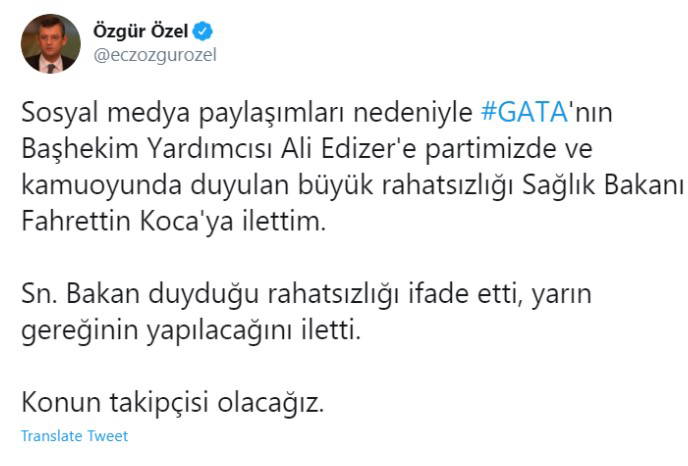 CHP Grup Başkanvekili ve Manisa Milletvekili Özgür Özel de Sağlık Bakanı Fahrettin Koca'nın durumdan rahatsız olduğunu, gün içerisinde konuyla ilgili aksiyon alınacağını söyledi.Özel, şu paylaşımda bulundu:Sosyal medya paylaşımları nedeniyle #GATA'nın Başhekim Yardımcısı Ali Edizer'e partimizde ve kamuoyunda duyulan büyük rahatsızlığı Sağlık Bakanı Fahrettin Koca'ya ilettim. Sn. Bakan duyduğu rahatsızlığı ifade etti, yarın gereğinin yapılacağını iletti. Konun takipçisi olacağız.