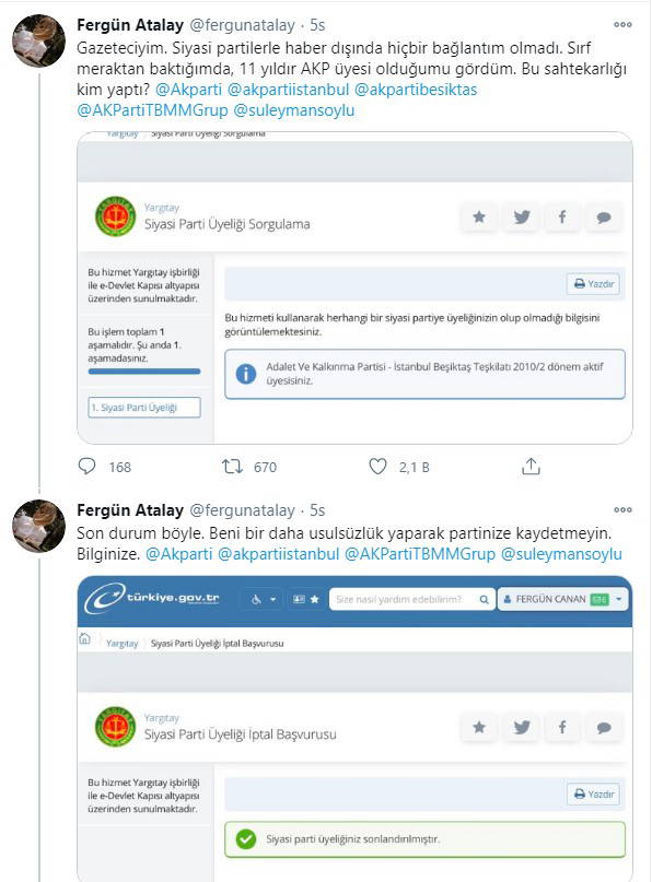 Halk TV’ye konuk olan gazeteci Fergün Atalay, “2010 yılından bu yana Beşiktaş ilçe yönetimi tarafından üye yapılmışım“ diyerek şu ifadeleri kaydetti: “E-Devlet üzerinden çıktım üyelikten. Ama anladığım kadarıyla benim TC kimlik numaramı ele geçirerek üye yapmışlar. Benim TC kimlik numaramı kim AKP ilçe örgütüne verdi? Ben bunu duyurduktan sonra yüzlerce kişi haberleri olmadan üyelik yapıldığını söyledi. Suç duyurusunda bulunacağım.“