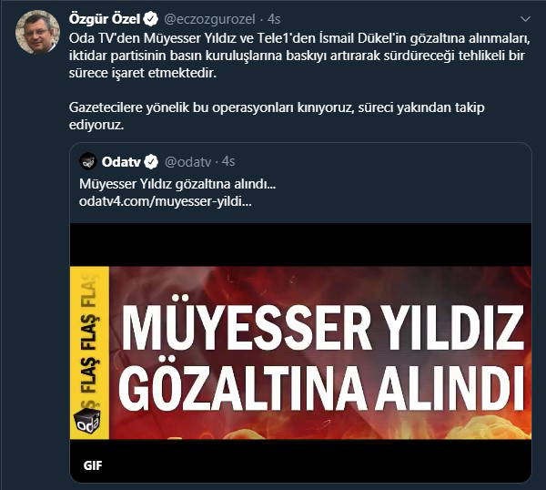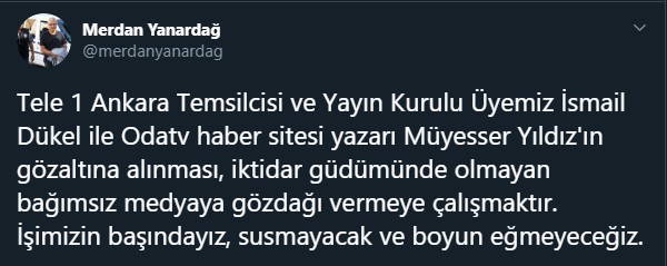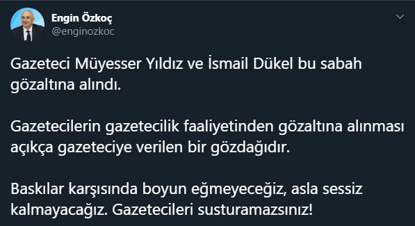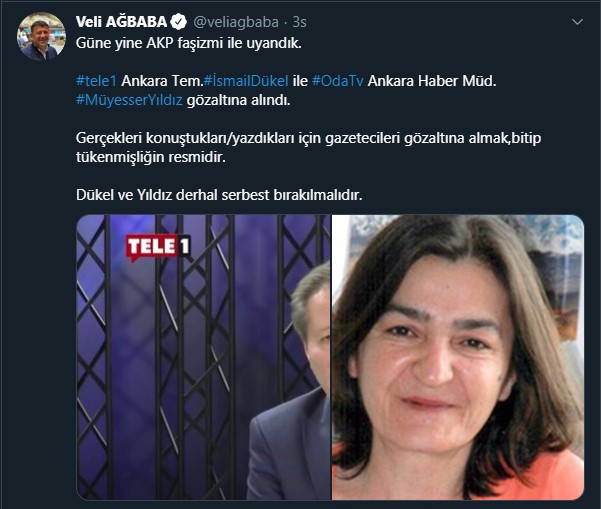 "Güne yine AKP faşizmi ile uyandık. tele1 Ankara Tem. İsmailDükel ile OdaTv Ankara Haber Müd. MüyesserYıldız gözaltına alındı. Gerçekleri konuştukları/yazdıkları için gazetecileri gözaltına almak, bitip tükenmişliğin resmidir. Dükel ve Yıldız derhal serbest bırakılmalıdır."