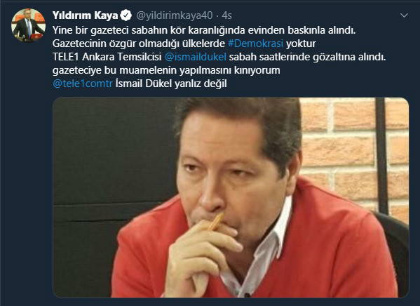 "Yine bir gazeteci sabahın kör karanlığında evinden baskınla alındı. Gazetecinin özgür olmadığı ülkelerde #Demokrasi yoktur TELE1 Ankara Temsilcisi @ismaildukel sabah saatlerinde gözaltına alındı. gazeteciye bu muamelenin yapılmasını kınıyorum @tele1comtr İsmail Dükel yanlız değil"