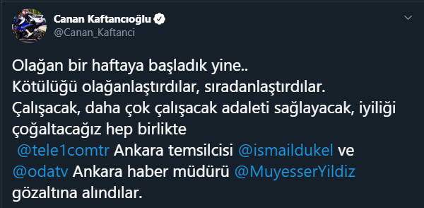 "Olağan bir haftaya başladık yine.. Kötülüğü olağanlaştırdılar, sıradanlaştırdılar. Çalışacak, daha çok çalışacak adaleti sağlayacak, iyiliği çoğaltacağız hep birlikte @tele1comtr Ankara temsilcisi @ismaildukel ve @odatv Ankara haber müdürü @MuyesserYildiz gözaltına alındılar."