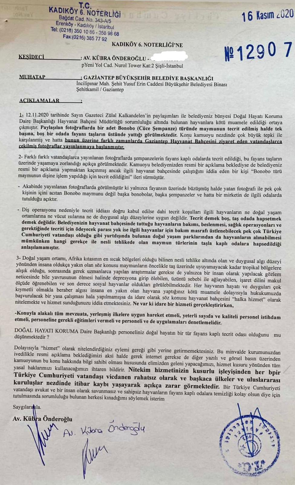 “Belediyeniz bünyesi Doğal Hayatı Koruma Daire Başkanlığı Hayvanat Bahçesi Müdürlüğü sorumluluğu altında bulunan hayvanlara kötü muamele edildiği ortaya çıkmıştır. Paylaşılan fotoğraflarda bir adet Bonobo (cüce şempanze) türünde maymunun tecrit edilmiş halde tek başına, boş bir odada fayans taşların üstünde yattığı görülmektedir. Konu kamuoyu nezdinde çok büyük tepki ile karşılanmış ve hatta bunun üzerine farklı zamanlarda Gaziantep Hayvanat Bahçesini ziyaret eden vatandaşlarca çekilmiş fotoğraflar yayınlanmaya başlanmıştır.