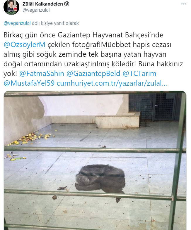 Yazarımız Zülal Kalkandelen önceki gün sosyal medya hesabı üzerinden yaptığı paylaşımda Gaziantep Hayvanat Bahçesi'nde dişine işlem yapılan maymunun soğuk zemin üzerinde yattığı bir görseli paylaşarak ilgili kişilere tepki gösterdi.