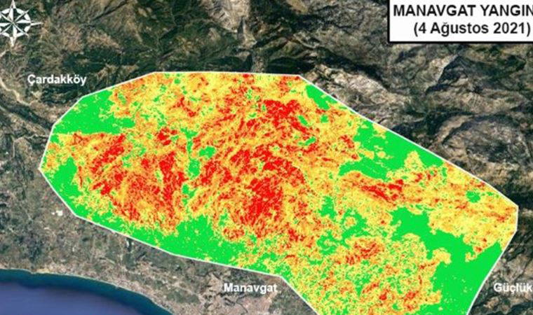"Gerçekleştirilen analizlerde, yangından etkilenen alanlar yanma şiddeti derecelerine göre düşük, orta düşük, orta yüksek ve yüksek olarak sınıflandırılarak tematik yangın haritaları üretildi. Analizler sonucunda, Manavgat'ta 56 bin 663, Marmaris'te 12 bin 935, Bodrum'da 11 bin 898, Köyceğiz'de 1629 ve Gündoğmuş'ta 685 olmak üzere toplam 83 bin 810 hektarlık alanın yandığı tespit edildi.