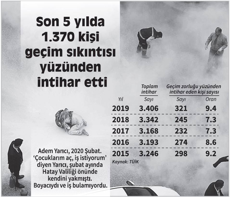 Yoksulluğun yarattığı çaresizlik yüzünden intihar edenlerin örneği çok. Adem Yarıcı adlı bir yurttaşın, 2020 Şubat’ta Hatay Valiliği önünde “Çocuklarım aç, iş istiyorum, anlamıyor musunuz” diyerek kendini yakması tüm Türkiye’yi derinden sarsmıştı. Yarıcı, hastaneye götürüldüğü sırada kalp krizi geçirmiş ve yaşamını yitirmişti. Aynı aylarda bir başka yurttaş ise Meclis önüne gelerek “Açım, çocuklarım aç!” diyerek intihar girişiminde bulunmuştu. 35 yaşındaki bu yurttaşa yardım edilmesi şöyle dursun, gözaltına alınmış, “yasadışı eylem” yapmaktan işlem yapılacağı belirtilmişti. Benzer olaylar ise sürüyor.