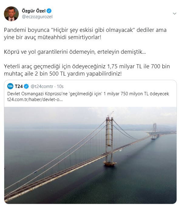 “Pandemi boyunca "Hiçbir şey eskisi gibi olmayacak" dediler ama yine bir avuç müteahhidi semirtiyorlar!Köprü ve yol garantilerini ödemeyin, erteleyin demiştik...Yeterli araç geçmediği için ödeyeceğiniz 1,75 milyar TL ile 700 bin muhtaç aile 2 bin 500 TL yardım yapabilirdiniz!”