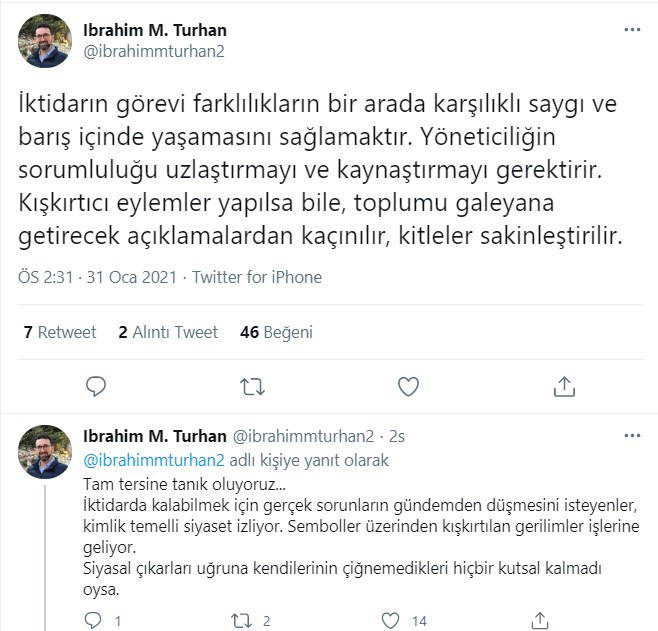 LGBTİ+ bireylere yönelik, hükümet kanadından yapılan ayrımcı açıklamaların ardından sosyal medya hesabından yaptığı paylaşımlarla durumu değerlendiren Turhan, iktidarın görevine ilişkin “Kışkırtıcı eylemler yapılsa bile, toplumu galeyana getirecek açıklamalardan kaçınılır, kitleler sakinleştirilir” dedi.