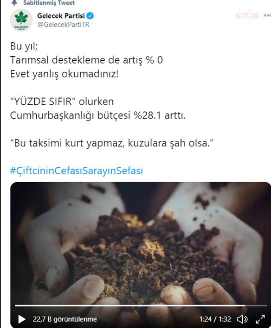 Gelecek Partisi, 2021 yılı Cumhurbaşkanlığı bütçesine 4 milyar 39 milyon lira, çiftçiye ise 22 milyar lira destek ayrılmasını bir video ile eleştirdi.
