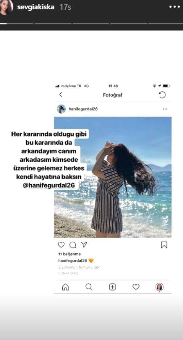 Sevgi Akiska, Instagram hesabından Hanife'nin başı açık çekilen fotoğraflarını "Kimse üzerine gelemez herkes hayatına baksın" notuyla paylaşarak destek verdi.