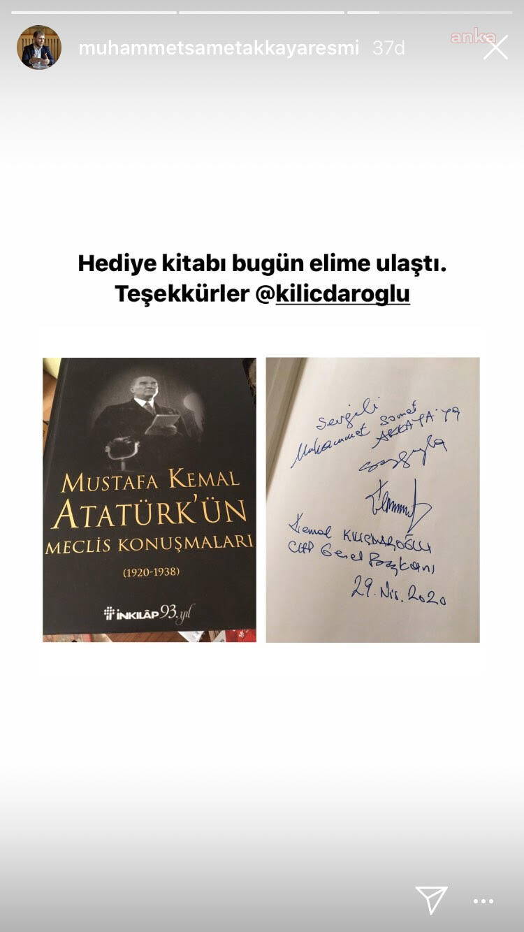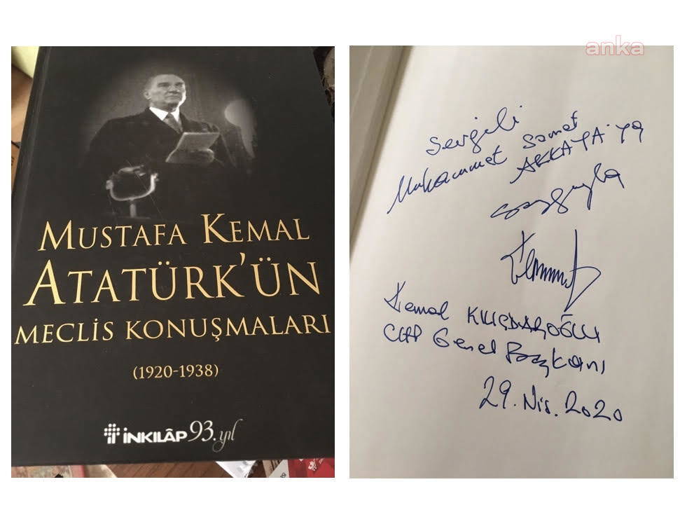 CHP Genel Başkanı Kemal Kılıçdaroğlu, Genç İmam Hatipliler Derneği Genel Başkanı Muhammet Samet Akkaya’ya “Mustafa Kemal Atatürk’ün Meclis Konuşmaları” kitabını imzalayarak hediye gönderdi. Akkaya, sosyal medya hesabından Kılıçdaroğlu’na teşekkür etti.