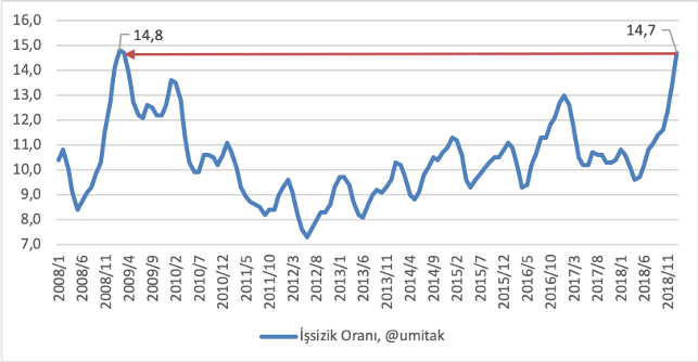 Ekonomist Ümit Akçay sosyal medya hesabından paylaştığı mesajında, "İşsizlikte Ocak 2019 rakamları, 2009 krizine dönmüş durumda" dedi.