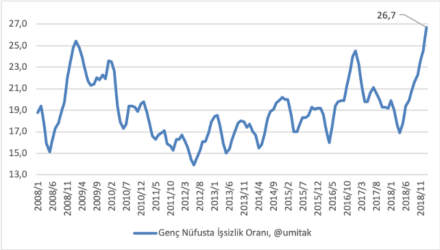 Türkiye genelinde 15 ve daha yukarı yaştakilerde işsiz sayısı 2019 yılı Ocak döneminde geçen yılın aynı dönemine göre 1 milyon 259 bin kişi artarak 4 milyon 668 bin kişi oldu. İşsizlik oranı 3,9 puanlık artış ile %14,7 seviyesinde gerçekleşti. Aynı dönemde; tarım dışı işsizlik oranı 4,1 puanlık artış ile %16,8 olarak tahmin edildi. Genç nüfusta (15-24 yaş) işsizlik oranı 6,8 puanlık artış ile %26,7 olurken,15-64 yaş grubunda bu oran 3,9 puanlık artış ile %15,0 olarak gerçekleşti.