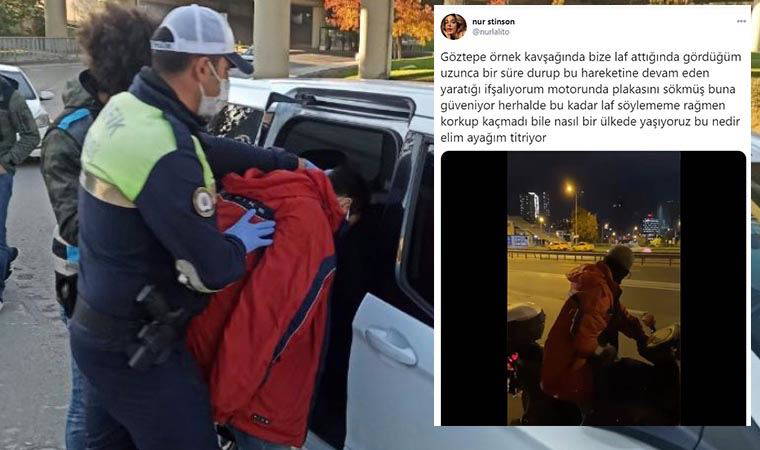 Yaşadığı korkutucu anları "Elim ayağım titriyor" diyerek sosyal medya hesabından paylaşan genç kadın, "Göztepe Örnek Kavşağı'nda bize laf attığında gördüğüm uzunca bir süre durup bu hareketine devam eden yaratığı ifşalıyorum. Motorunda plakasını sökmüş buna güveniyor herhalde. Bu kadar laf söylememe rağmen korkup kaçmadı bile. Nasıl bir ülkede yaşıyoruz bu nedir elim ayağım titriyor" dedi.