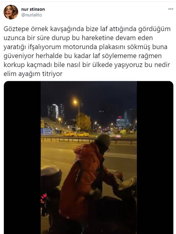 "nur stinson" isimli Twitter hesabı kullanıcısı bir kadın İstanbul Göztepe'de motosiklet sürücüsü tarafından taciz edildiği anları kameraya aldı.