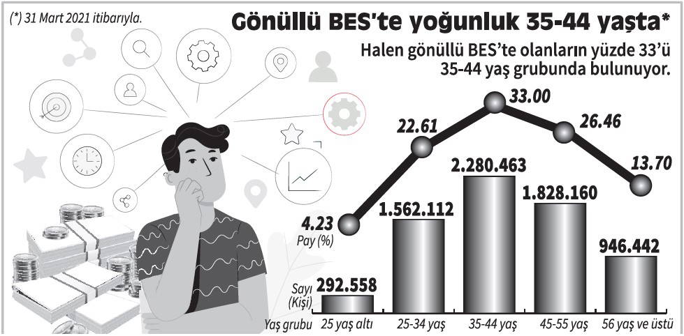 Gençlerin bireysel emeklilik sistemine (BES) dahil edilmesi kapsamında, 18 yaş altıyla ilgili yasal mevzuatın 30 Haziran’a kadar tamamlanmasıyla ilgili çalışmaları sürerken, izlenmesi gereken yol da tartışılıyor. Ayrıca halen gönüllü BES’teki payı yüzde 4.2 olan 25 yaş altı grubun sisteme çekilmesi için de yeni paketler hazırlanıyor.