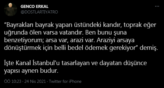 “Bayrakları bayrak yapan üstündeki kandır, toprak eğer uğrunda ölen varsa vatandır. Ben bunu şuna benzetiyorum; arsa var, arazi var. Araziyi arsaya dönüştürmek için belli bedel ödemek gerekiyor” demiş.