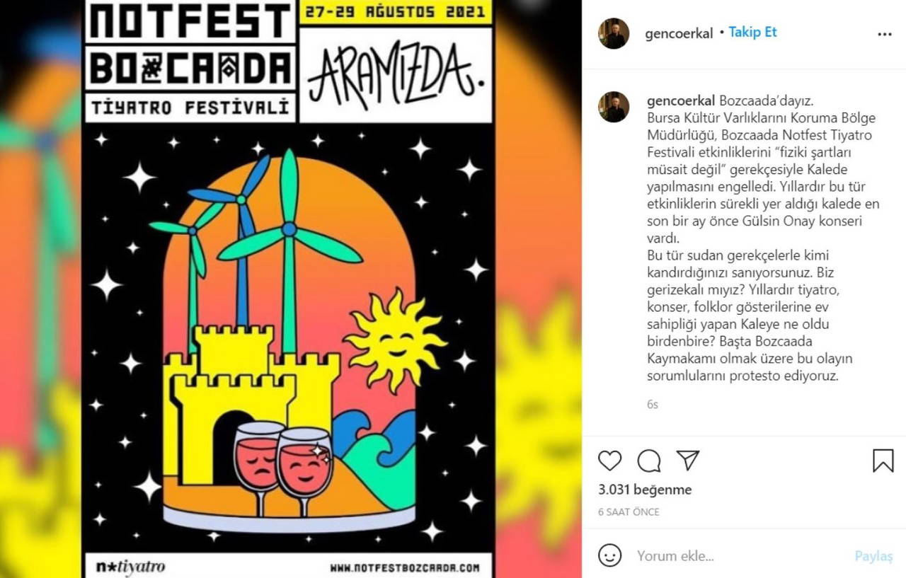 "Bozcaada’dayız. Bursa Kültür Varlıklarını Koruma Bölge Müdürlüğü, Bozcaada Notfest Tiyatro Festivali etkinliklerini 'fiziki şartları müsait değil' gerekçesiyle kalede yapılmasını engelledi. Yıllardır bu tür etkinliklerin sürekli yer aldığı kalede en son bir ay önce Gülsin Onay konseri vardı. Bu tür sudan gerekçelerle kimi kandırdığınızı sanıyorsunuz? Biz gerizekalı mıyız? Yıllardır tiyatro, konser, folklor gösterilerine ev sahipliği yapan kaleye ne oldu birdenbire? Başta Bozcaada Kaymakamı olmak üzere bu olayın sorumlularını protesto ediyoruz."