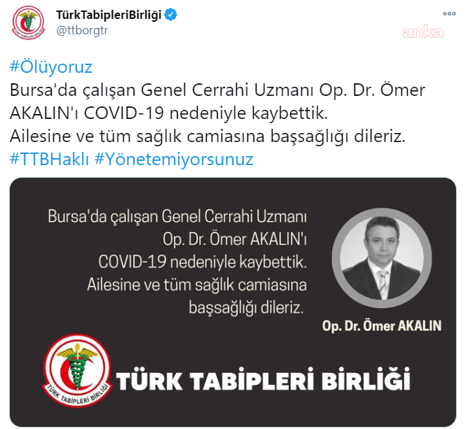 "Bursa'da çalışan Genel Cerrahi Uzmanı Op. Dr. Ömer Akalın'ı COVID-19 nedeniyle kaybettik. Ailesine ve tüm sağlık camiasına başsağlığı dileriz."