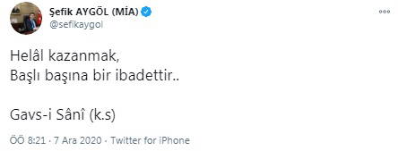 İçişleri Bakanlığı Nüfus Vatandaşlık İşleri Genel Müdürü Şefik Aygöl, Twitter hesabından "Helâl kazanmak, Başlı başına bir ibadettir.." diye paylaşımda bulundu.