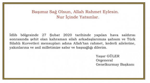 Orgeneral Güler mesajında, "İdlib bölgesinde 27 Şubat 2020 tarihinde yapılan hava saldırısı sonrası şehit olan kahraman silah arkadaşlarımıza şahsım ve Türk Silahlı Kuvvetleri mensupları adına Allah'tan rahmet, kederli ailelerine, yakınlarına ve asil milletimize sabır ve başsağlığı dilerim" ifadelerine yer verdi.