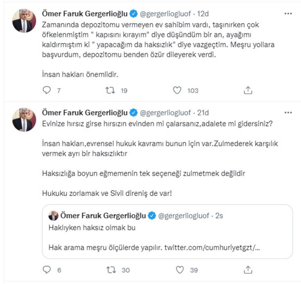 HDP'li Gergerlioğlu'nun bu yöndeki tweetine bazı kullanıcılar tepki gösterdi. Tepki gösterenlerden akademisyen Neşe Özgen, "İncil'de yazdığı gibi mi: (Matta 5, 39) 'Sağ yanağına vurana sol yanağını da çevir.' Milletvekilinin de bunu söyleyeceğini bildiği için parçalıyor işçi o mülkiyeti zaten. Öfkesini haklı çıkardınız" dedi. Özgen'e yanıt veren Gergerlioğlu ise, "Haksızlıkla hak aranmaz, sivil direniş yapsa uygun olurdu. Öfkesi haklı olabilir, yaptığı haksız. İnsan hakları böyle der. Milletvekili hukuki yollardan başkasını yapmaz" ifadelerini kullandı.