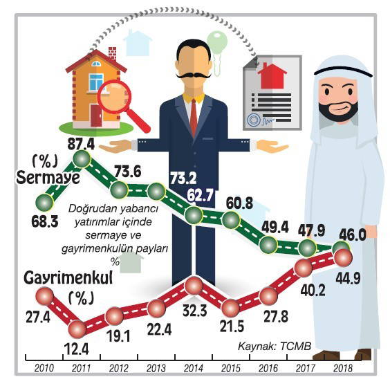 Merkez Bankası verilerine göre, 2015’te 19.2 milyar dolar olan Türkiye’ye gelen net doğrudan yabancı yatırım 2018’de toplam 13.1 milyar dolar olurken, bunun 5.9 milyar dolarını gayrimenkul, 6 milyar dolarını sermaye yatırımları oluşturdu. Böylece konut, arsa gibi taşınmaz mal alımlarını kapsayan gayrimenkul yatırımları ile fabrika gibi üretim tesileri kurmayı kapsayan sermaye yatırımları hemen hemen eşitlendi.