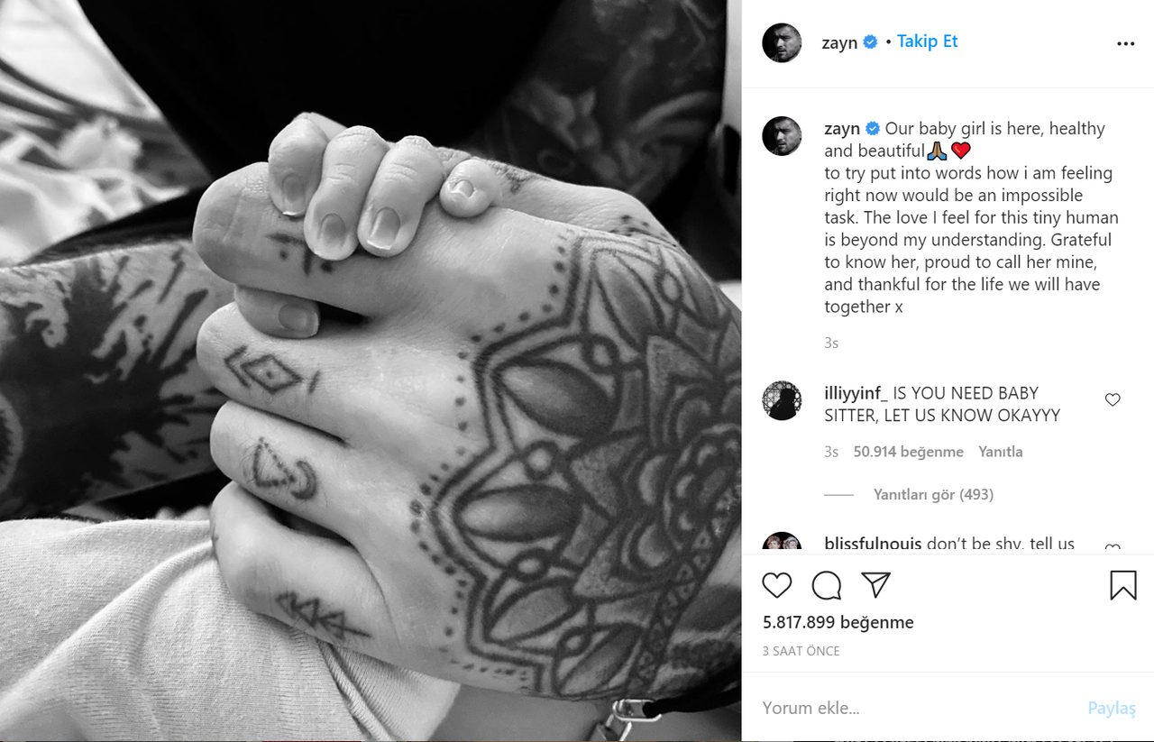 Malik, Hadid ile birlikte bir kızı olduklarını sosyal medya hesabından yaptığı paylaşım ile duyurdu.