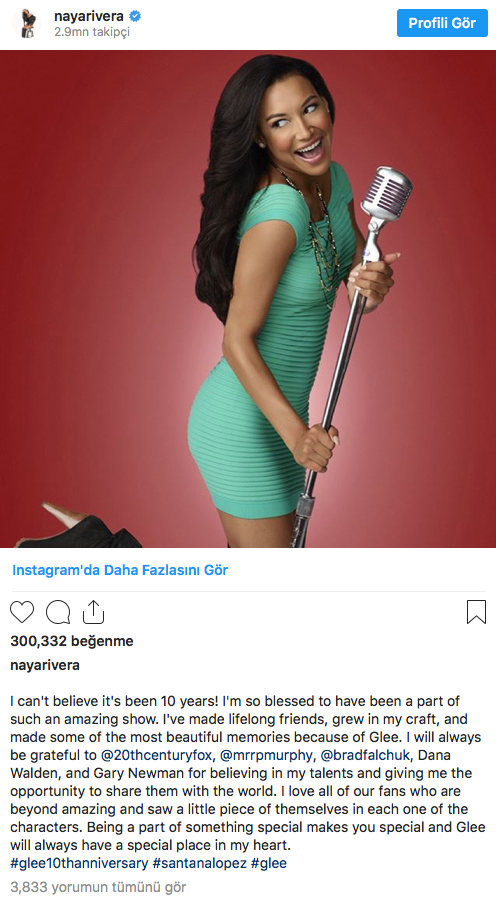 Naya Rivera dizinin 10. yılında Instagram’dan bir paylaşım yaparak “Bu muhteşem dizinin bir parçası olduğum için çok şanslıyım” yazmıştı.