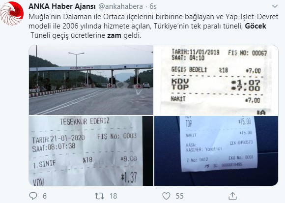Muğla’nın Dalaman ile Ortaca ilçelerini birbirine bağlayan ve Yap-İşlet-Devret modeli ile 2006 yılında hizmete açılan Göcek Tüneli geçiş ücretlerine zam geldi.