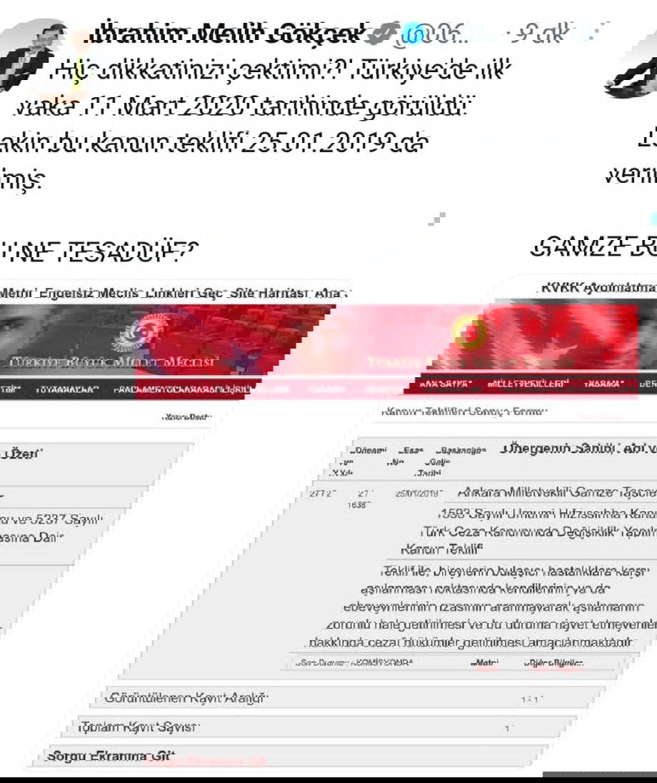 Gökçek mesajında, "Hiç dikkatinizi çektimi?! Türkiye'de ilk vaka 11 Mart 2020 tarihinde görüldü. Lakin bu kanun teklifi 25.01.2019 da verilmiş. GAMZE BU NE TESADÜF?" ifadelerini sarf etti.