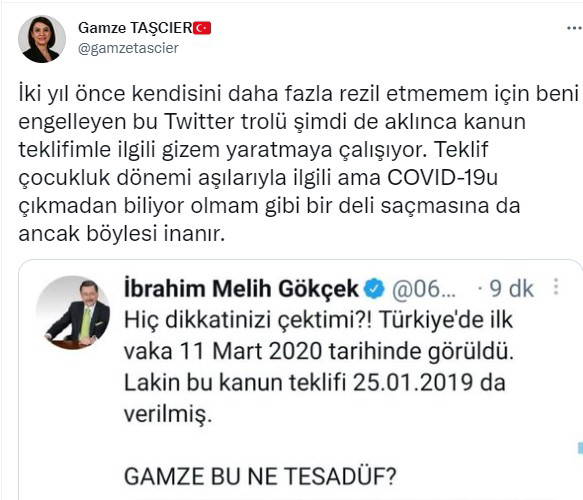 Gökçek'e tepki gösteren Taşçıer, "İki yıl önce kendisini daha fazla rezil etmemem için beni engelleyen bu Twitter trolü şimdi de aklınca kanun teklifimle ilgili gizem yaratmaya çalışıyor" diyerek kanun teklifi hakkında bilgi verdi. CHP'li Gamze Taşçıer, "Teklif çocukluk dönemi aşılarıyla ilgili ama COVID-19u çıkmadan biliyor olmam gibi bir deli saçmasına da ancak böylesi inanır" dedi.