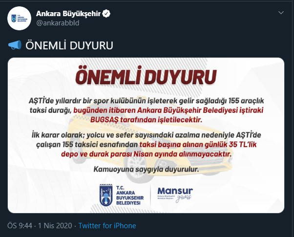 Belediyeden yapılan açıklamada, "Bir spor kulübünün yıllardır işleterek gelir sağladığı taksi durağı, bugünden itibaren belediye iştiraki BUGSAŞ tarafından işletilecektir. İlk karar olarak, yolcu ve sefer sayısının azalması nedeniyle AŞTİ’de çalışan taksi esnafından taksi başına alınan günlük 35 TL’lik depo ve durak parası Nisan ayında alınmayacaktır” denildi.