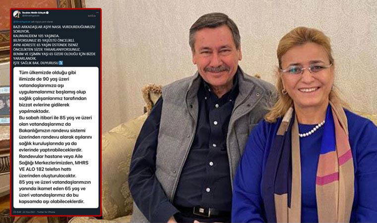 "Bazı arkadaşlar aşıyı nasıl vurdurduğumuzu soruyor. Kayınvalidem 105 yaşında. Biliyorsunuz 85 yaşüstü öncelikli. Aynı adreste 65 yaşın üstünde iseniz öncelikten siz de yararlanıyorsunuz. Benim ve eşimin yaşı 65 üzeri olduğu için biz de yararlandık. İşte Sağlık Bakanlığı duyurusu."