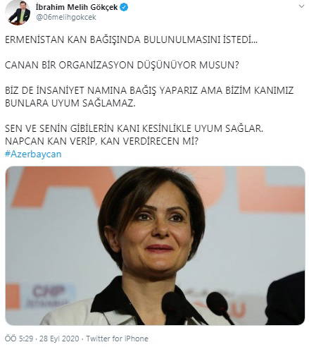 Ermenistan'ın kan bağışı çağrısı yaptığını belirten Gökçek, CHP İstanbul İl Başkanı'na "Canan bir organizasyon düşünüyor musun? Senin gibilerin kanı kesinlikle uyum sağlar" gibi ifadelerle seslendi.