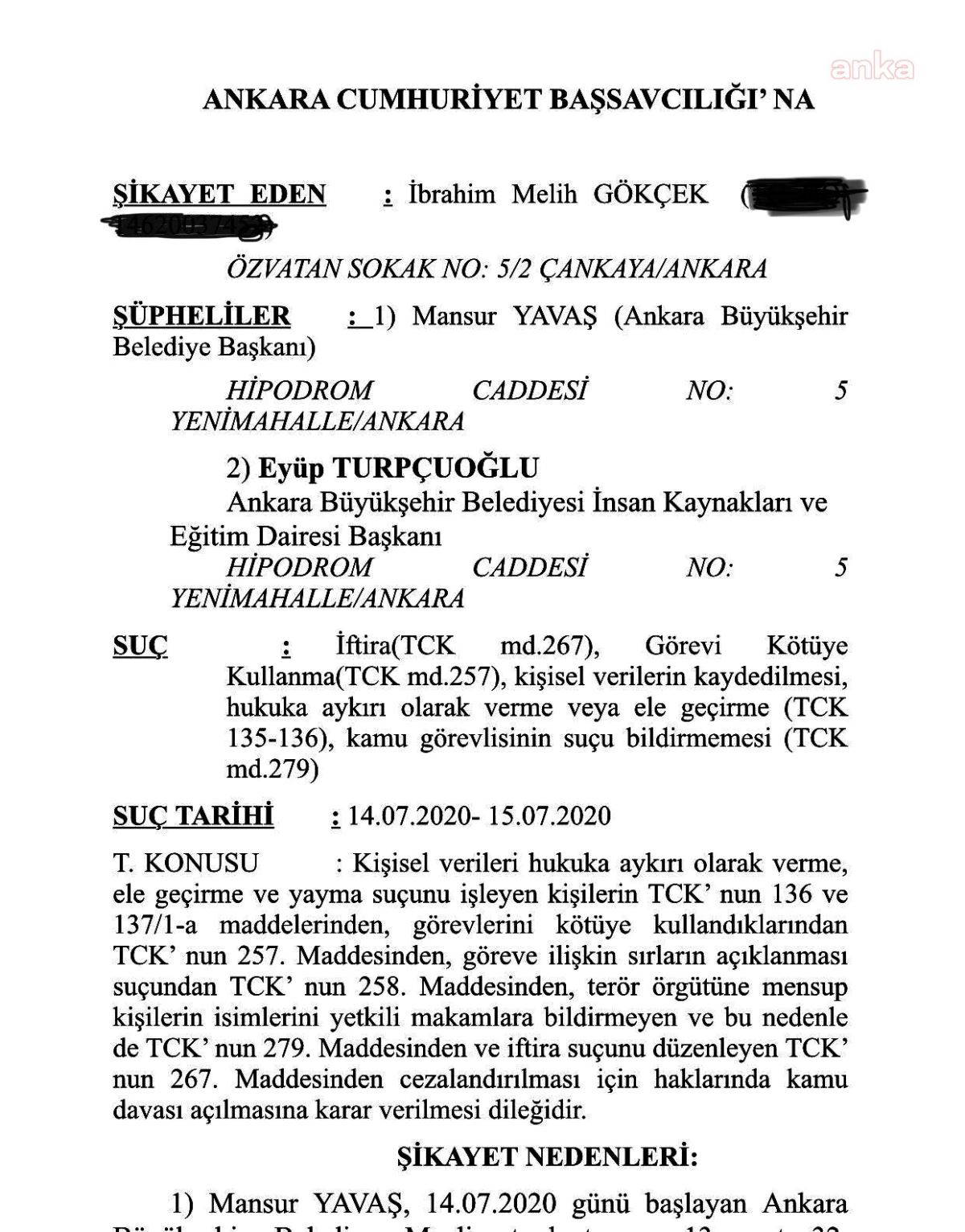 Ankara Büyükşehir Belediye Başkanı Mansur Yavaş, eski Başkan Melih Gökçe döneminde işe alınan kişilerle ilgili “torpil listesi” yayımlamıştı. Gökçek, Yavaş’ın yayımladığı “torpil listesi”nin ardından Ankara Cumhuriyet Başsavcılığı’na suç duyurusunda bulundu. Yavaş ve ABB İnsan Kaynakları ve Eğitim Dairesi Başkanı Eyüp Turpçuoğlu’a “iftira, görevi kötüye kullanma, kişisel verilerin kaydedilmesi, hukuka aykırı olarak verme veya ele geçirme, kamu görevlisinin suçu bildirmemesi” suçlamalarında bulundu.