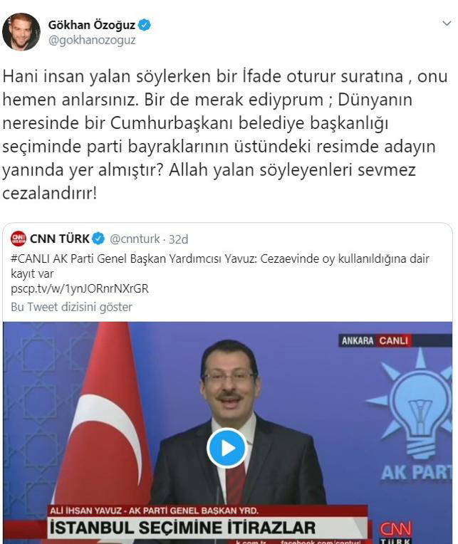 "Hani insan yalan söylerken bir İfade oturur suratına , onu hemen anlarsınız. Bir de merak ediyorum ; Dünyanın neresinde bir Cumhurbaşkanı belediye başkanlığı seçiminde parti bayraklarının üstündeki resimde adayın yanında yer almıştır? Allah yalan söyleyenleri sevmez cezalandırır!" yazdı.