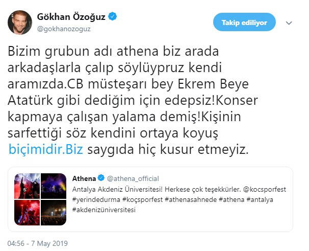 Bu mesajlardan birisini de Athena’nın solisti Gökhan Özoğuz paylaştı. Özoğuz, Twitter'da İmamoğlu'nu etiketleyerek şunları yazdı: