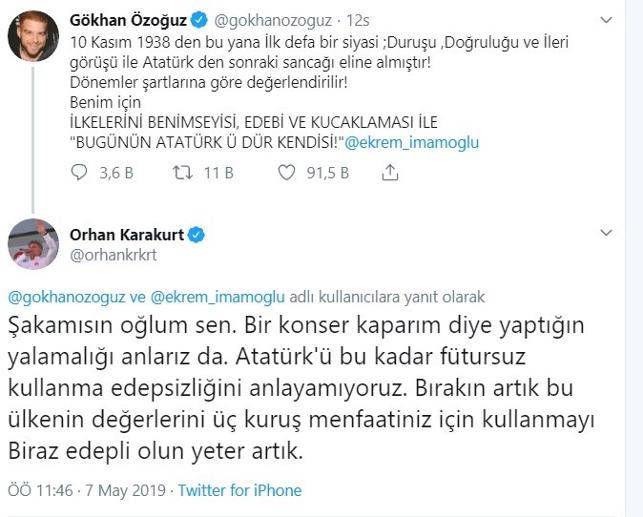 Karakurt'a Twitter'dan yanıt veren Özoğuz, ""Bizim grubun adı athena biz arada arkadaşlarla çalıp söylüyoruz kendi aramızda.CB müsteşarı bey Ekrem Beye Atatürk gibi dediğim için edepsiz! Konser kapmaya çalışan yalama demiş! Kişinin sarfettiği söz kendini ortaya koyuş biçimidir.Biz saygıda hiç kusur etmeyiz." ifadelerini kullandı.