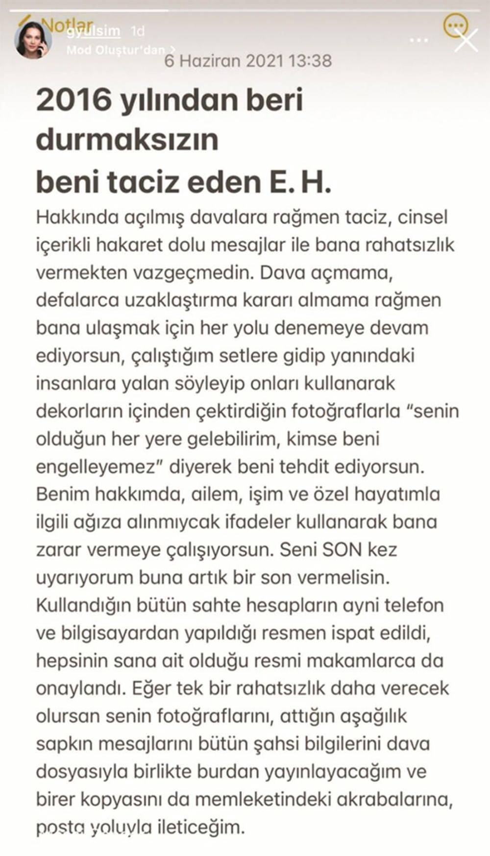 "2016 yılından beri durmaksızın beni taciz eden E. H. Hakkında açılmış davalara rağmen taciz, cinsel içerikli hakaret dolu mesajlar ile bana rahatsızlık vermekten vazgeçmedin. Dava açmama, defalarca uzaklaştırma kararı almama rağmen bana ulaşmak için her yolu denemeye devam ediyorsun, çalıştığım setlere gidip yanındaki insanlara yalan söyleyip onları kullanarak dekorların içinden çektirdiğin fotoğraflarla 'senin olduğun her yere gelebilirim, kimse beni engelleyemez' diyerek beni tehdit ediyorsun."