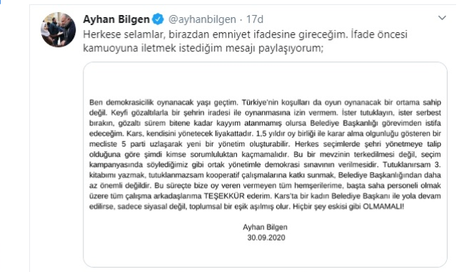 Ayhan Bilgen, kişisel Twitter hesabından, "Herkese selamlar, birazdan emniyet ifadesine gireceğim. İfade öncesi kamuoyuna iletmek istediğim mesajı paylaşıyorum" diyerek, istifa edeceğini duyurdu.