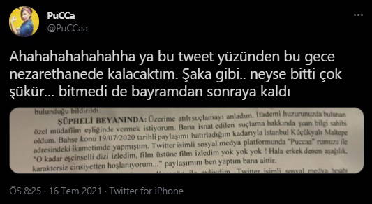 Sosyal medya fenomeni ve yazar, ‘Pucca’ takma isimli Pınar Karagöz 16 Temmuz akşamı gözaltına alınmıştı. Twitter'dan emniyete götürüldüğünü duyuran Karagöz, "Az önce kapıya iki polis geldi, şu an emniyete gidiyoruz beraber:. Sebebini de söylemiyorlar. Hakkımda hayırlısıı.." ifadelerine yer vermişti.