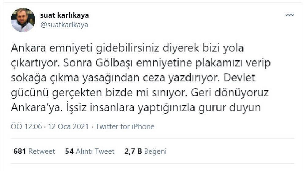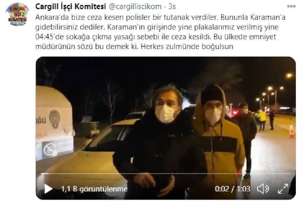 O paylaşımda, “Ankara’da bize ceza kesen polisler bir tutanak verdiler. Bununla Karaman’a gidebilirsiniz dediler. Karaman’ın girişinde yine plakalarımız verilmiş yine 04:45’de sokağa çıkma yasağı sebebi ile ceza kesildi. Bu ülkede emniyet müdürünün sözü bu demek ki. Herkes zulmünde boğulsun” ifadelerine yer verildi.