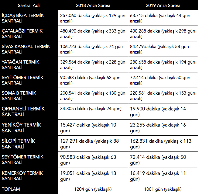 Sivas’ta bulunan Kangal Termik Santrali, 2019’da toplam 68.935.477 TL teşvik aldı; eğer arızalı olduğu günler için teşvik verilmeseydi bu rakam sadece 9.939.609 TL olacaktı. Benzer şekilde Seyitömer Termik Santrali 2019’da toplam 100.748.225 TL teşvik aldı, eğer arızalı olduğu günler hesaba katılsaydı alacağı miktar sadece 10.658.692 TL olacaktı yani neredeyse 10’da biri… Çatalağzı Termik Santrali de 2018 yılında 365 günün 333’ünde, 2019’da ise 298’inde arızalıydı. Buna karşın 2018 yılında 35.034.693 TL, 2019 yılında ise 52.839.083 TL teşvik aldı.