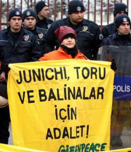 Japonya'nın Ankara Büyükelçiliği önünde sabah saatlerinde toplanan Greenpeace üyeleri, Japonca, İngilizce ve Türkçe "Junichi, Toru ve balinalar için adalet" yazılı pankart açtılar.