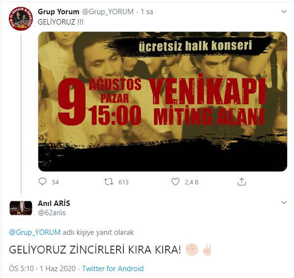 Türkiye'deki protest müziğin öncüsü olan ve Türkiye'deki birçok dilde müzik yapan Grup Yorum, Twitter adresinden, "Geliyoruz zincirleri kıra kıra" diyerek konser duyurusu yaptı.